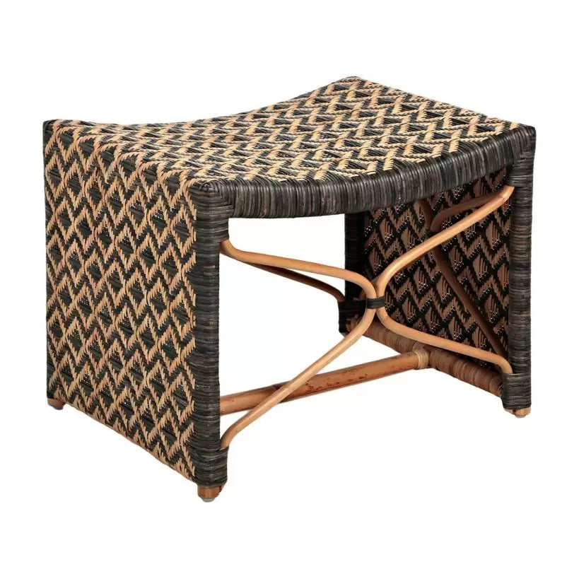 The Bennet Stool by Gabby showcases timeless craftsmanship with a graceful waterfall silhouette and two-tone handwoven rattan. Featuring an intertwined diamond pattern in contrasting black and natural rattan, this artisan rattan stool brings striking texture and eco-friendly charm to any room.