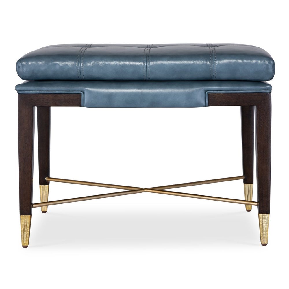 Seductive tapered legs are capped with dazzling gold finished metal feet. A removable tufted blue top grain leather seat cushion provides maximum comfort. Made of rich walnut veneer.
