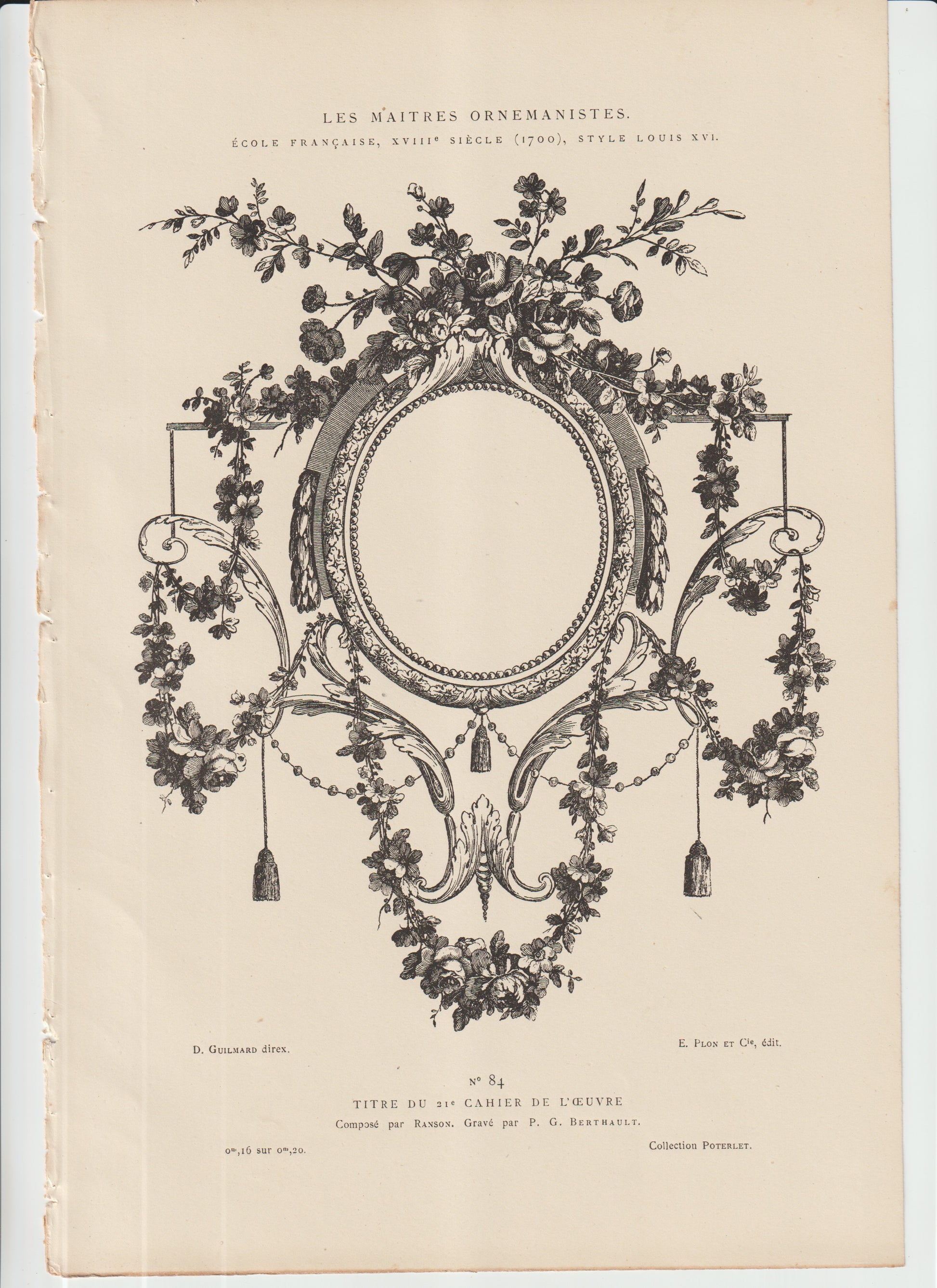 This exquisite ornamental title page plate exemplifies the refined aesthetic principles of Louis XVI design, sourced from the seminal *Les Maîtres Ornemanistes* collection published by Plon et Cie circa 1860. Rendered by the master designers Ranson and Berthault, Plate 84 showcases the delicate symmetry, classical motifs, and sophisticated ornamentation characteristic of 18th-century French decorative arts. An essential reference for design historians, artisans, and collectors seeking authentic period documentation of neoclassical ornamentation and typographic elegance.