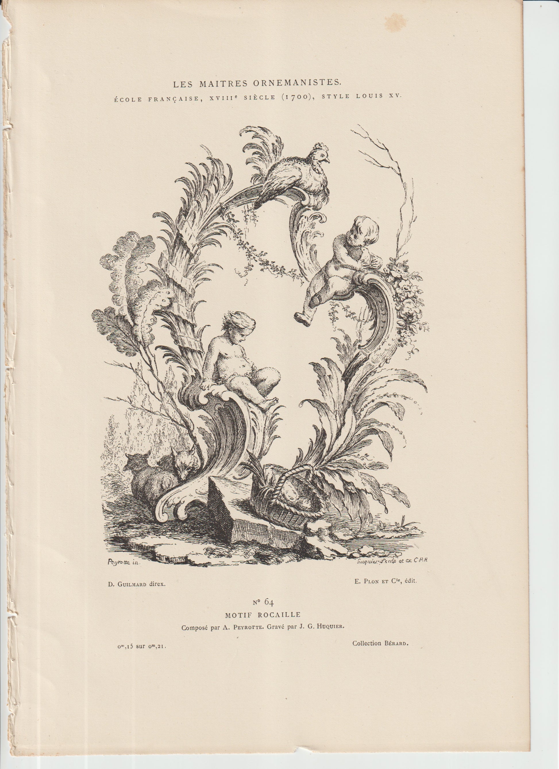 Rococo 'Motif Rocaille' Engraving by Huquier after Peyrotte — Plon et Cie Edition An exquisite historical engraving capturing the ornamental essence of 18th-century Rococo design. This refined print features the characteristic asymmetrical scrollwork and naturalistic motifs that defined the period's aesthetic vocabulary. Executed by the master engraver Huquier after Peyrotte's original composition, this Plon et Cie edition represents a significant example of French decorative arts documentation. The delicate linework and sophisticated spatial composition make it an authoritative reference for design historians and collectors of period ephemera. A distinguished addition to galleries, studies, or curated collections celebrating classical European ornamentation.