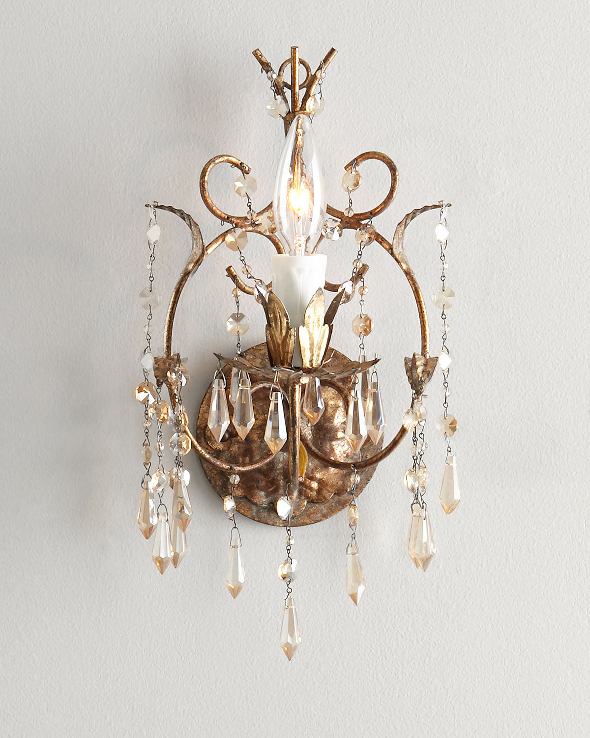 Elegant antique gold sconce with beautiful, hanging prisms.